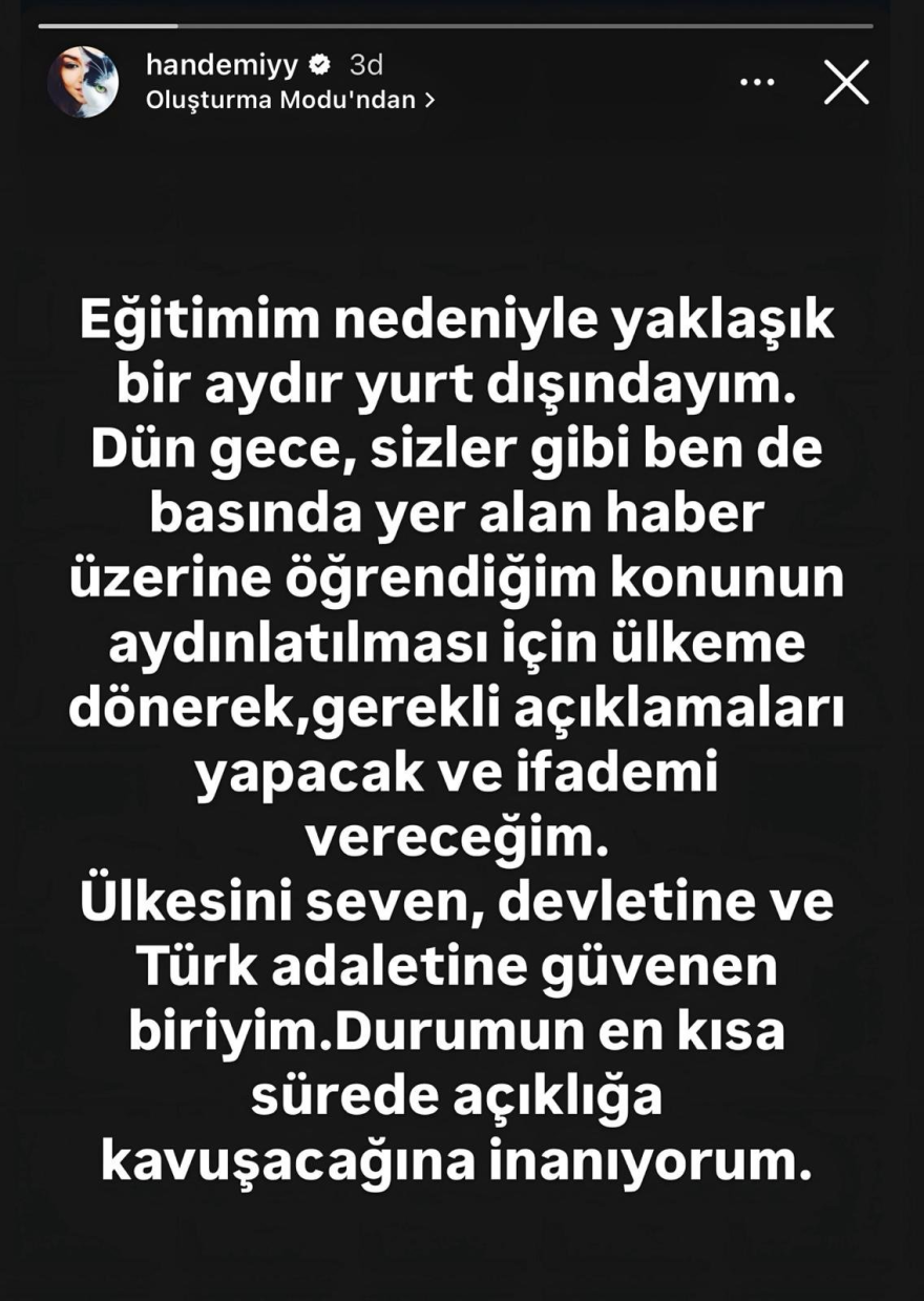 Η ηθοποιός έκανε σχετική ανάρτηση στον προσωπικό της λογαριασμό στο Instagram, μόλις η είδηση έγινε γνωστή, όπου εξήγησε πως δεν βρισκόταν στην Τουρκία, ωστόσο θα επέστρεφε για να μπορέσει να καταθέσει: «Λόγω της εκπαίδευσής μου βρίσκομαι στο εξωτερικό εδώ και περίπου έναν μήνα. Χθες το βράδυ, όπως κι εσείς, έμαθα από τα μέσα ενημέρωσης για το θέμα που απασχολεί την επικαιρότητα και θα επιστρέψω στη χώρα μου για να γίνουν οι απαραίτητες διευκρινίσεις και να καταθέσω. Είμαι ένας άνθρωπος που αγαπά τη χώρα του και εμπιστεύεται το κράτος και την τουρκική δικαιοσύνη. Πιστεύω ότι η κατάσταση θα ξεκαθαρίσει το συντομότερο δυνατό», έγραψε.
